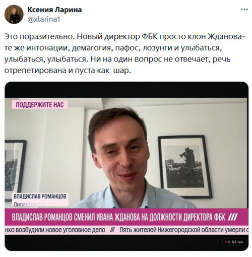 Я совсем про этот сюжет забыл, но его (не)удачно разблокировала в памяти Ксения Ларина. Она в твиттере побежала критиковать нового директора ФБК Влада Романцова — вот он ей лицом не понравился, такой уровень экспертизы у независимой журналистки — и ее довольно резко осадила Евгения Альбац.