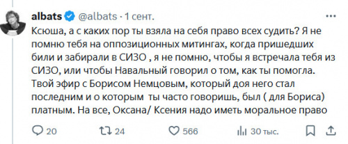 Про "моральное право всех судить" - это у Альбац любимый конек. Сама Альбац всех судит всегда и везде, но это ей, великой Альбац, можно, а когда кто-то другой всего лишь делает какое-то замечание - это вызывает вот такую вот вполне хамскую отповедь. И на оппозиционных митингах Ларину не помнит (Ларина на эти митинги ходила неоднократно), и Навальный Альбац не говорил, что Ларина помогла (потрясающе совершенно), и последний эфир с Немцовым, который Ларина вела, для Бориса был платным. В общем, не имеет Ларина морального права хоть что-то вякать по поводу нового директора ФБК.