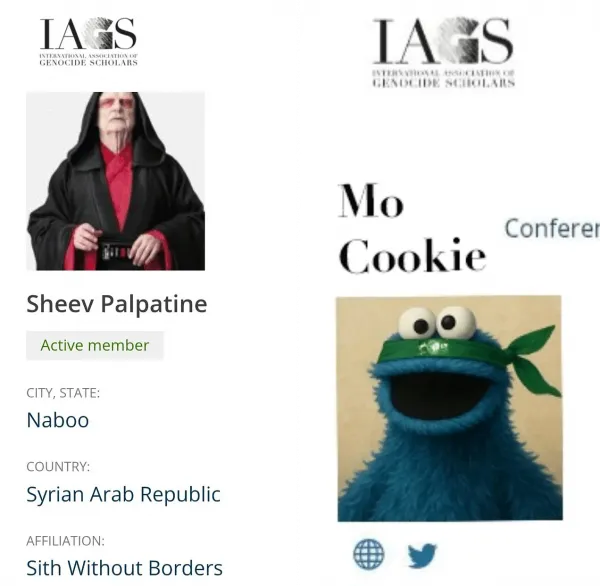 Более того, вступить в эту ассоциацию может любой желающий, заплатив 30 баксов, и там сейчас идет пополнение учеными и экспертами с мировым именем: император Паллатин, злодей из франшизы «Звездные войны»; Адольф Гитлер из Газы; и «Mo Cookie», который является Куки-монстром, носящим зеленый шарф с логотипом ХАМАС.
