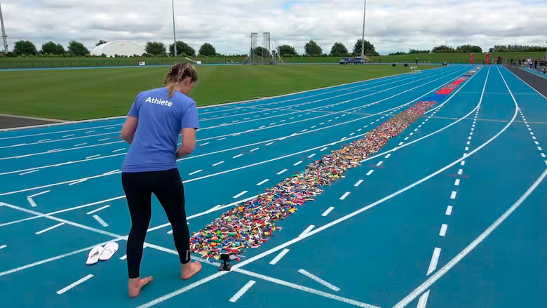 Габриэль Уолл побила рекорд Гиннесса по самому быстрому пробегу 100 метров босиком по кубикам Lego в Крайстчерче.