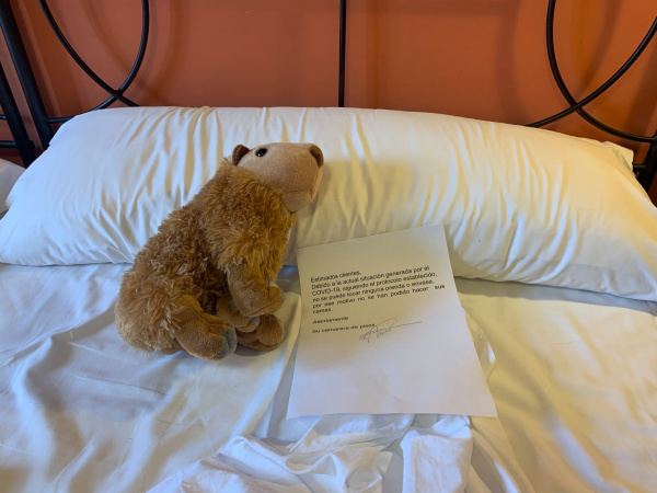 ? Ребенок оставил на кровати в испанском отеле свою мягкую игрушку. Вернулись, а в номере не убрано. Зато рядом с капибарой лежит целое письмо, напечатанное на принтере с оригинальной подписью: