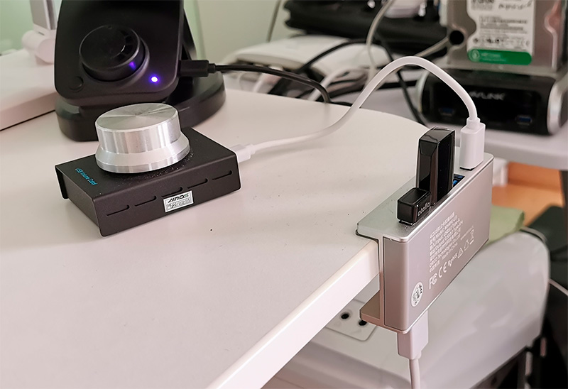 (Кстати, вот этот USB-хаб со струбциной от Orico на фото - вообще бомба, обалденно удобная вещь. Я себе еще один заказал: там есть модель с двумя портами и слотом под карту SD - надоело мне с картой памяти от фотоаппарата вниз к слоту компьютера лазить.)