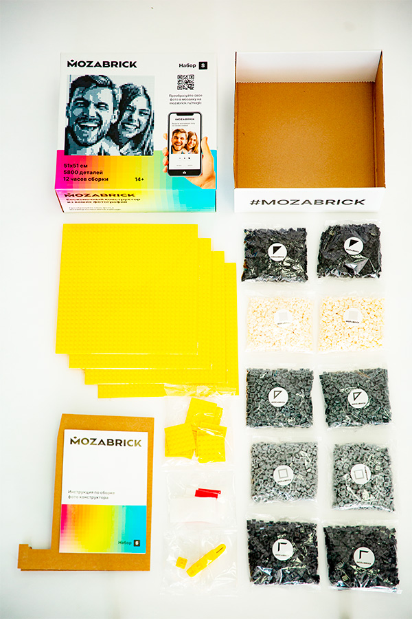Как это все работает? На сайте фотоконструктора Mozabrick можно купить один из двух видов универсального пазла – это большая красивая коробка, в которой лежит огромное количество деталей мозаики. И там есть два варианта: