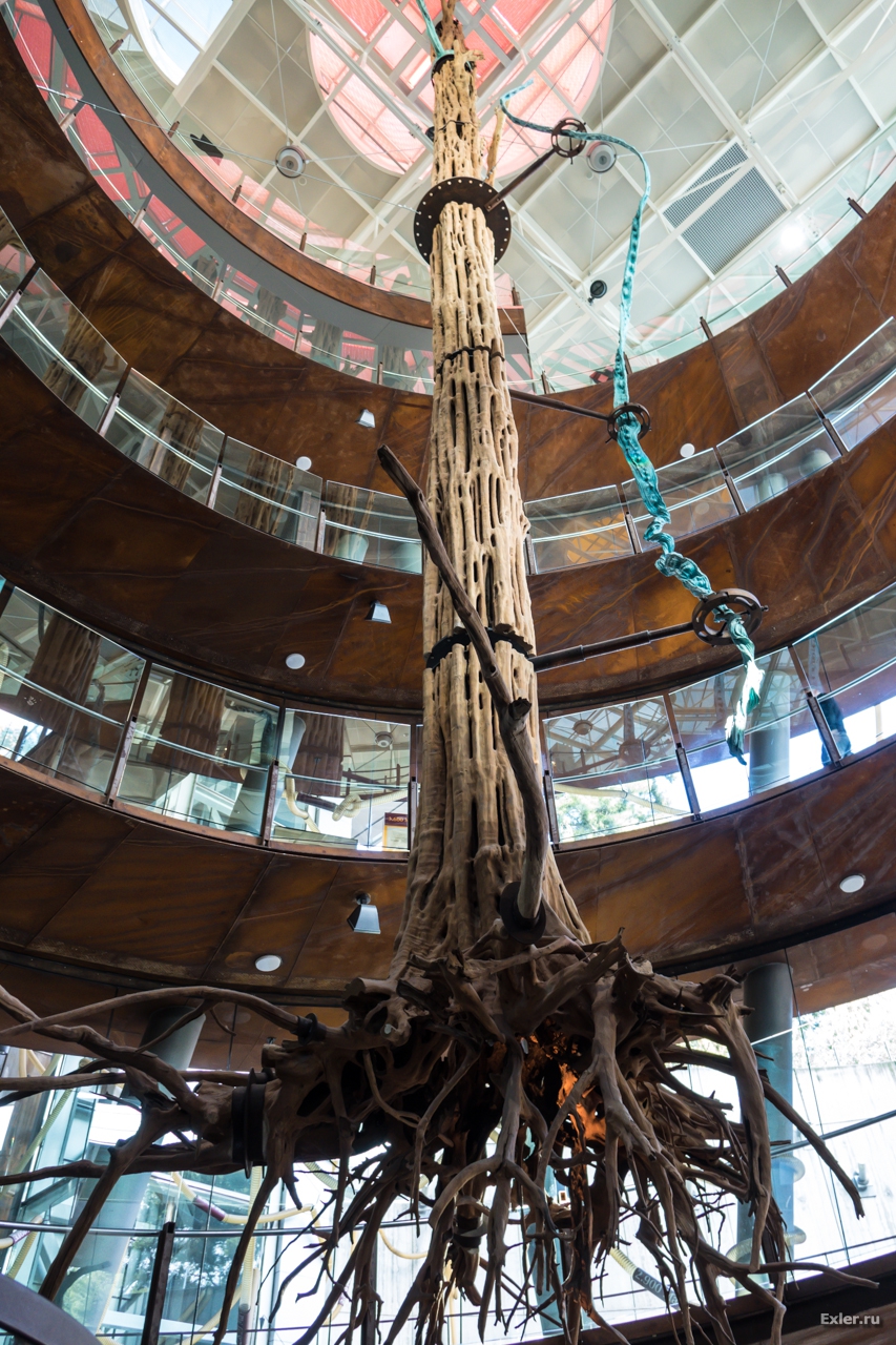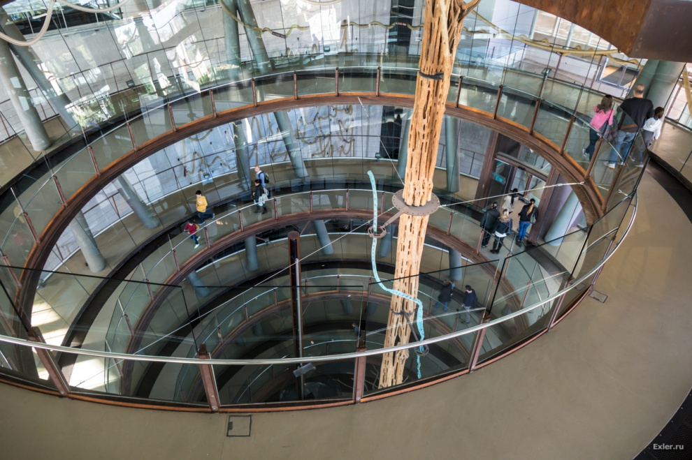 При входе попадаешь на длинный спиральный спуск в несколько этажей. Посредине спуска растет Древо Познания.