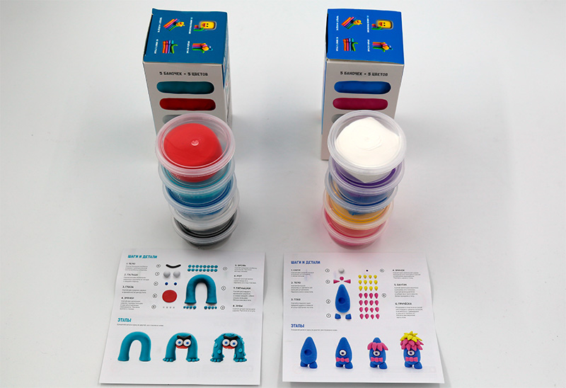В каждом наборе - пять банок пластилина определенных цветов, бумажная инструкция.