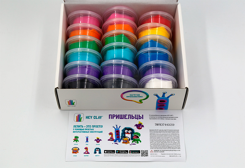 18 банок пластилина различных цветов. Цвета и количество пластилина распределены таким образом, что вы можете сделать из него всех монстров, изображенных на коробке - шесть фигурок. По каждому монстру есть видеоинструкция, доступная в соответствующем приложении Hey Clay (оно есть и под Andorid, и под iPhone).