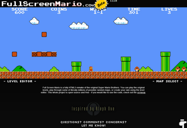 Полноэкранный супербрат Марио. Работает, как я понял, только на Google Chrome. Полная имитация старой доброй игрушки, старого доброго CGA и старой доброй двухбитной музычки.