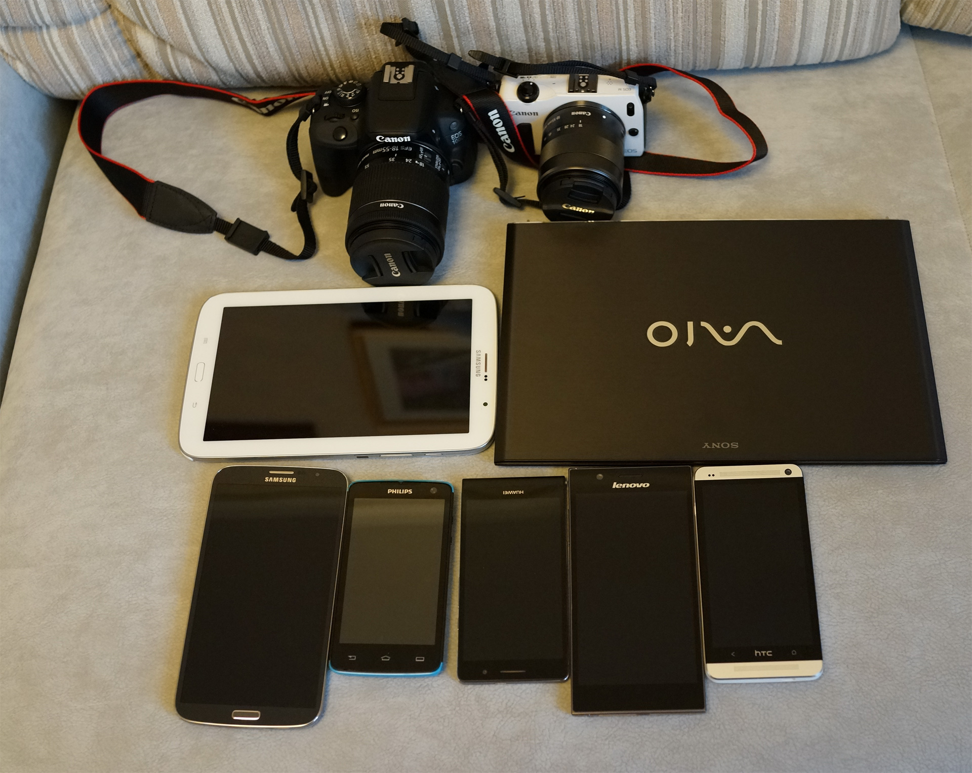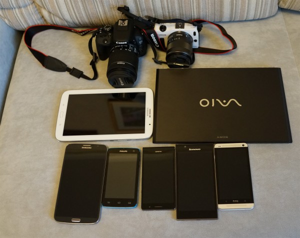 Традиционный лучок приготовленных для "цифрового рюкзачка" всяких железок, которые я беру с собой в Испанию, чтобы писать по ним обзоры. Большинство привезено интернет-магазином "Юлмарт", за что им большое спасибо, но есть также смартфоны, привезенные другими партнерами или производителями. Ну и еще в рюкзачок, разумеется, будет заложен Sony RX1, которым это дело фотографировалось.