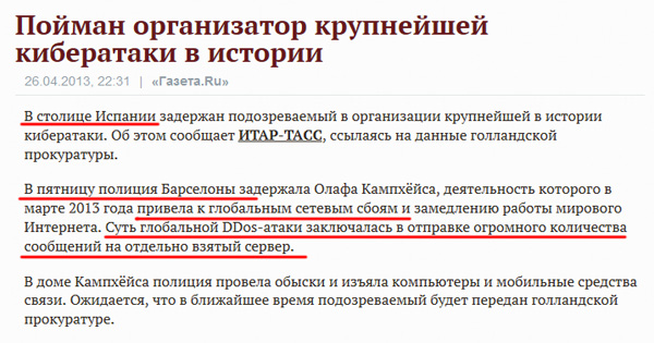 Уровень журналистики в Газете.ру вставляет не по-детски. Барселона у них стала столицей Испании, а замедление работы мирового Интернета заключалось в отправке огромного количества сообщений на отдельно взятый сервер. Видимо, на этом отдельно взятом сервере и хранился весь мировой Интернет.