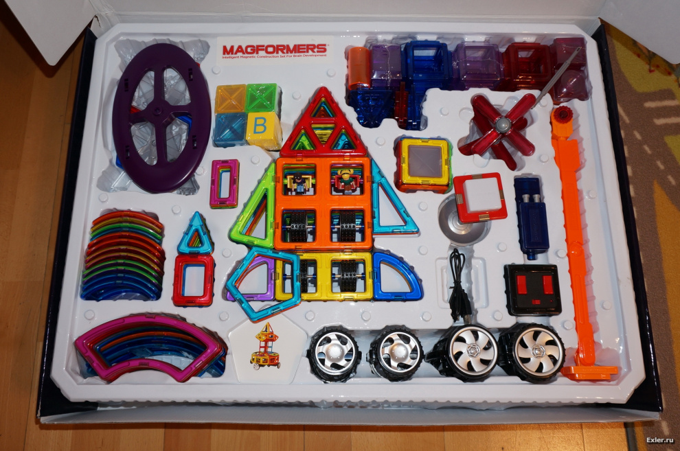 Фирма Magformers была настолько любезна, что недавно прислала для ознакомления новый интереснейший набор, который называется Magformers Miracle Brain Set. В нем аж 258 элементов, куда входят довольно экзотические вещи, вроде движущихся колес с пультом дистанционного управления, вращающиеся блоки, элементы со светодиодами и прочие прелести. Вот так это все выглядит.