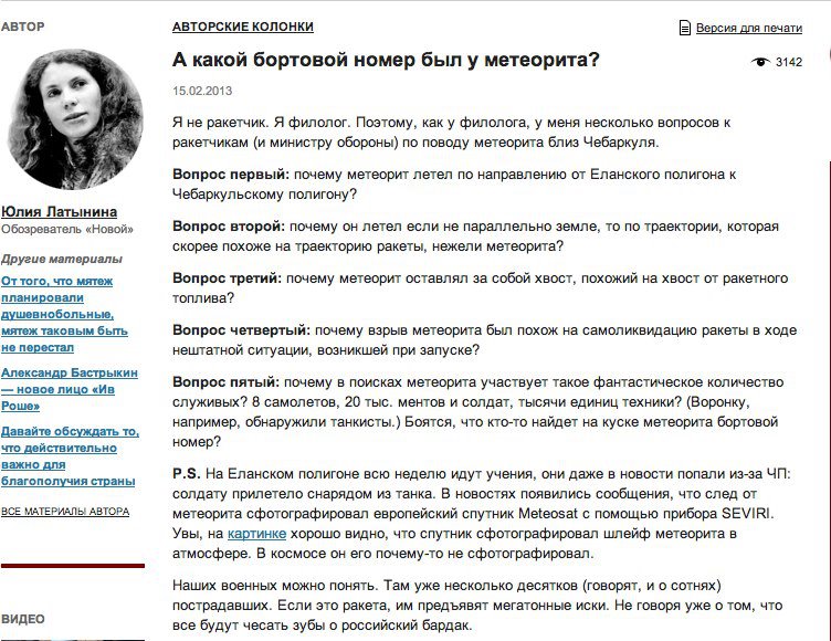 Вопрос третий. Почему метеорит в небе выглядел как метеорит, а не как ракета? Уж если делаете метеоритную ракету, она должна выглядеть как ракета. Всем известно, что когда метеорит входит в атмосферу, он летит строго перпендикулярно спроецированному в плоскость глазу смотрящего, так что в небе он виден как точка, постепенно увеличивающаяся в размерах и перекрывающая в конце концов всю небесную твердь.