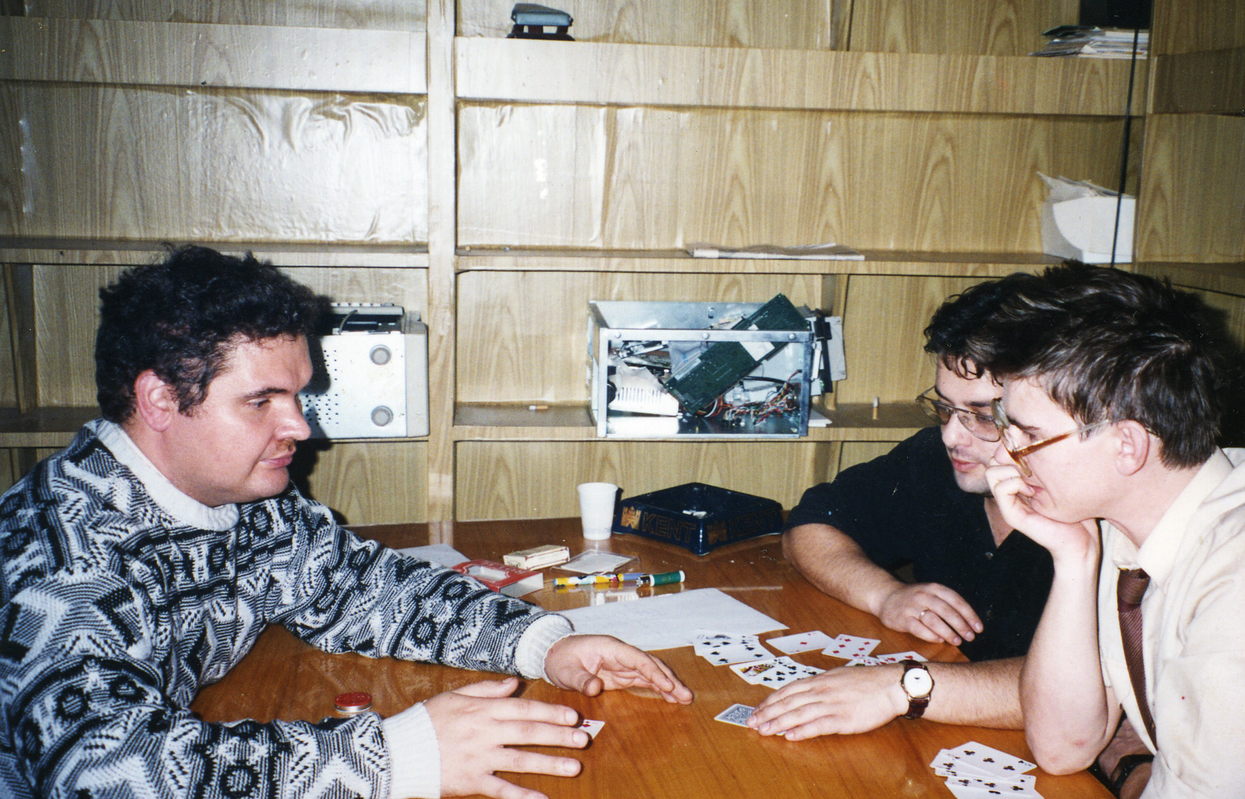 Вот мы с Юриком и с Базилем в знаменитом "Сафроновском подвале" учимся играть в бридж. Целая эпоха...