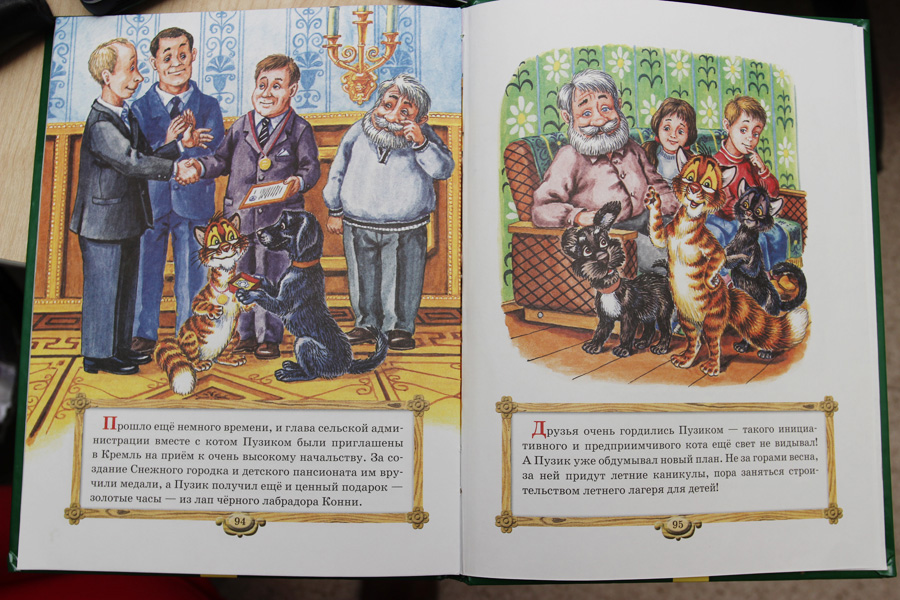 В другой истории Пузик и Тузик решили построить снежный городок «для дошколят», подписали все документы в мэрии, а потом «были приглашены в Кремль на прием к очень высокому начальству. За создание городка Пузик получил золотые часы из лап лабрадора Конни». Тут же корявенько нарисованы Владимир Владимирович и еще некто. То ли охранник, то ли Дмитрий Анатольевич.