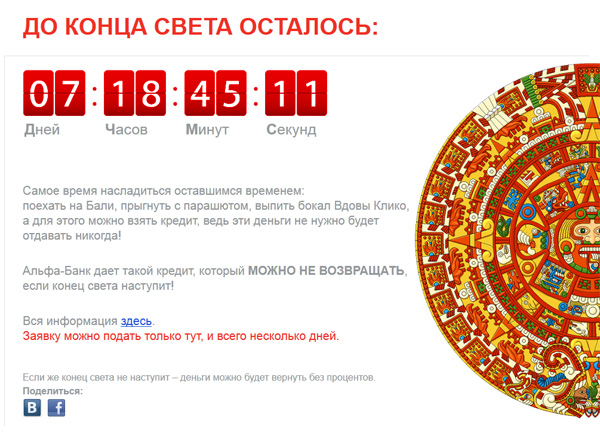 Но с объявлением они конкретно прокололись. Что значит "Окончание в 12 часов 21 декабря"? Это означает, что они сами в Конец Светы не верят, то есть признаются в том, что являются жуликами.
