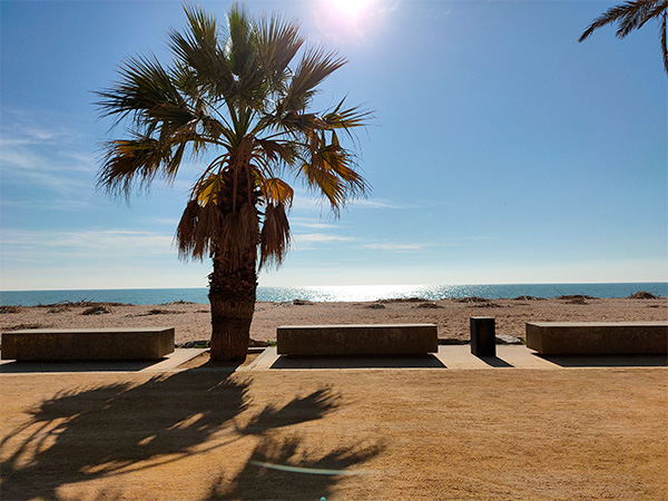 Вчера как следует разогнаться не получилось: встречный ветер был где-то в 12-14 м/с, он меня замедлил, так что где-то через три километра коленка разболелась и пришлось садиться отдыхать. Ну, не проблема, на пальмовой аллее, до которой я дошел, скамеек полно. Сел на свободную.