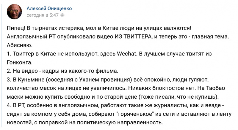 P.S. У френда в Facebook народ развлекался: сочиняли сценарий о смертельной эпидемии. Предложили вариант: кто-то заказал посылку с Aliexpress, получил, открыл, а оттуда вирус ка-а-а-а-ак прыгнет... Не пройдет, говорю я, вирус передается только воздушно-капельным путем, через посылку его передать невозможно. Никто ни разу в жизни не заразился, например, гриппом от посылки.
