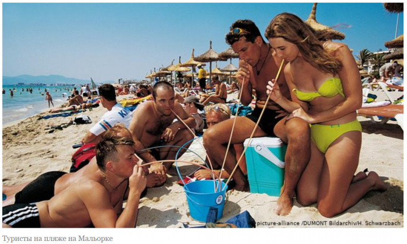 На самом деле все правильно делают. Вот эта фотка выше из немецкого издания - очень характерная. В наших калейских краях я такое неоднократно наблюдал: на пляж приходит группка немецких то ли студентов, то ли просто гопников, они с собой приносят вот такое ведерко с алкоголем (нередко - довольно ядреным, судя по последствиям), дружно пьют оттуда из длинных соломинок, в процессе постепенно сначала впадают в нирвану, после этого нирвана постепенно переходит в фазу большого заблева - в общем, зрелище не слишком приятное, сразу могу сказать. Хуже этого только гопники-британцы, но с ними вообще мало кто может сравниться - по сравнению с ними самые быдловатые "тагил-растагил" выглядят интеллигентными и тонко чувствующими людьми.