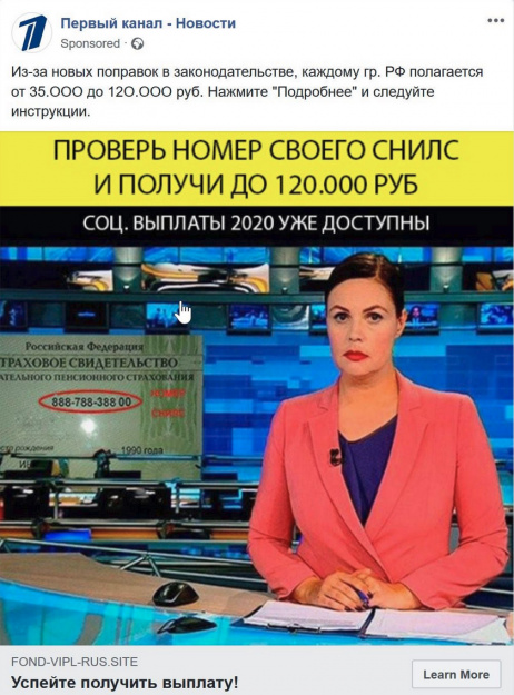 Прикольно. Facebook трепетно следит за пользователями и постоянно то морозит чей-то аккаунт, то блокирует. (Причем часто - по совершенно идиотским причинам.) А вот в рекламе у них идет полнейшая разлюли-малина. Сейчас уже появилось совершенно незамутненное жулье с крайне незамысловатым разводняком. Мне об этом рассказывали, но я сам не встречал, а тут наконец-то попалось - ура.
