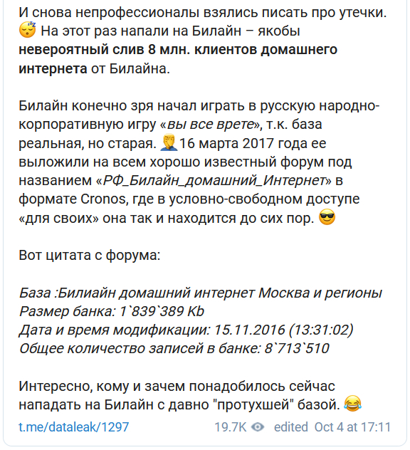 По соцсетям активно репостят новость о том, что из Beeline якобы слили аж 8 миллионов анкет пользователей со всеми данными. (При этом недавно прошла вполне достоверная новость о том, что данные карт 200 клиентов "Сбера" были похищены.)