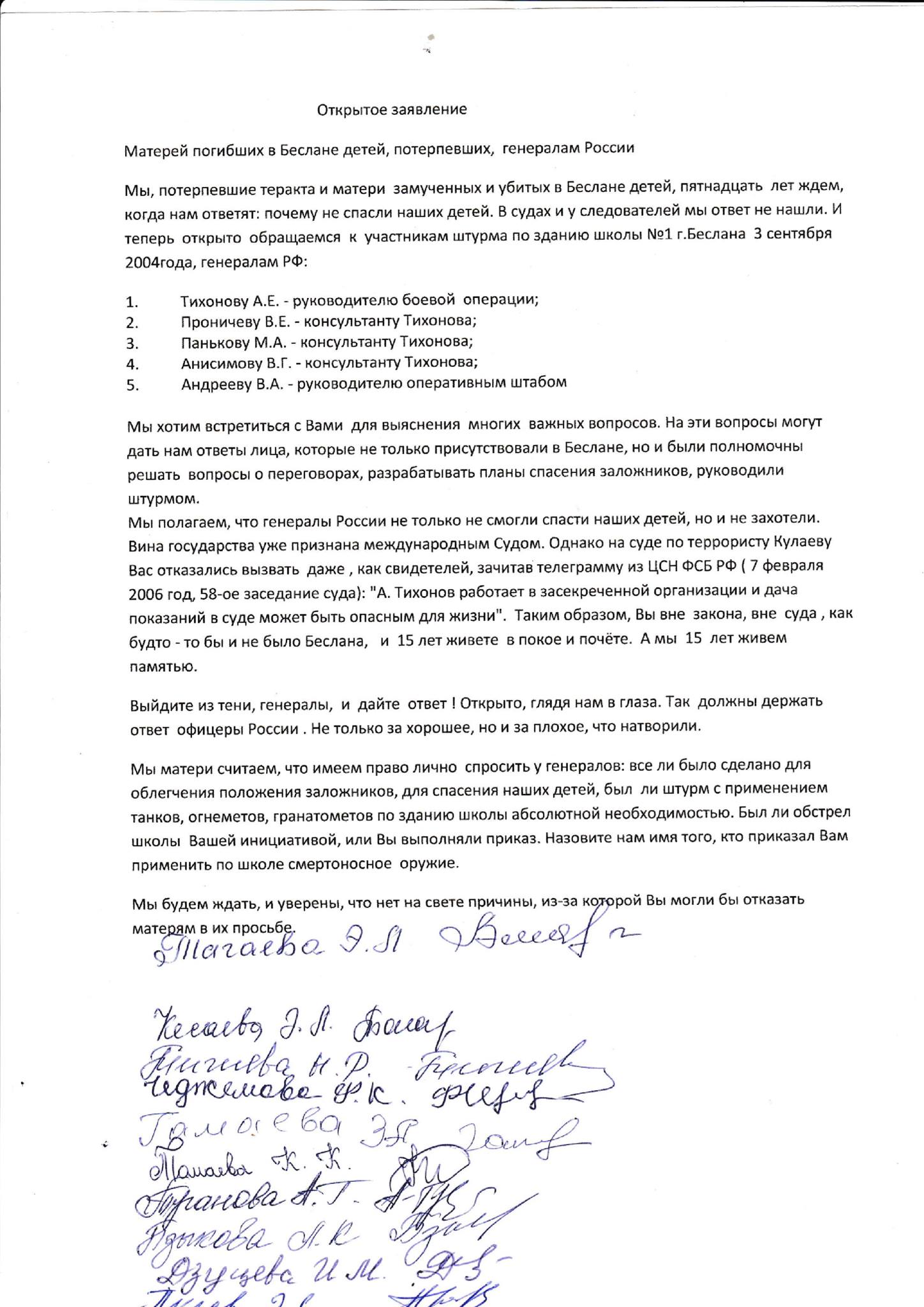 Нет таких слов, которые могли бы утешить людей, потерявших в сентябре 2004 года своих детей и близких, но есть слова благодарности тем, кто рисковал своей жизнью, чтобы спасти заложников, и тем, кто хранит наш покой сегодня. (Отсюда.)
