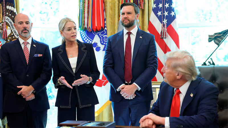 Генеральный прокурор США Пэм Бонди выступает рядом с вице-президентом США Дж. Д. Вэнсом и Терри Коулом, администратором Управления по борьбе с наркотиками США (DEA), во время подписания указов президентом США Дональдом Трампом в Овальном кабинете Белого дома в Вашингтоне, округ Колумбия, США, 25 августа 2025 года. REUTERS/Jonathan Ernst