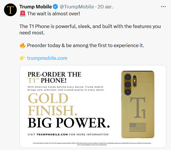 Кстати, с сайта Trump Mobile, где пока висит старое изображение, исчезло упоминание о том, что он "с гордостью разработан и изготовлен в США". Теперь там написано только "произведено с учетом американских ценностей".