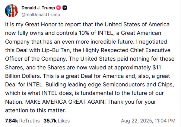 Для меня большая честь сообщить, что Соединенные Штаты Америки теперь полностью владеют и контролируют 10% акций INTEL, великой американской компании, у которой впереди еще более невероятное будущее. Я заключил эту сделку с Лип-Бу Таном, уважаемым генеральным директором компании. Соединенные Штаты не заплатили за эти акции ни цента, а их стоимость в настоящее время оценивается примерно в 11 миллиардов долларов. Это отличная сделка для Америки, а также для INTEL. Производство передовых полупроводников и микросхем, чем занимается INTEL, имеет основополагающее значение для будущего нашей страны. СДЕЛАЕМ АМЕРИКУ ВЕЛИКОЙ СНОВА! Благодарю вас за внимание к этому вопросу.