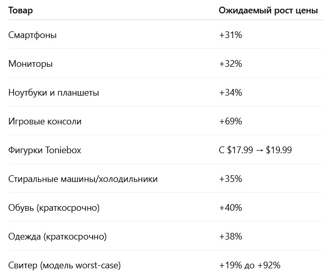 Вот смотрите. Трамп ввел пошлины в 50% на все индийские товары. Однако эти пошлины будут платить не индийские производители, там же не так это все работает, правильно? Эти пошлины будут платить импортеры индийских товаров. И, чтобы компенсировать потерю этих средств, импортеры будут прибавлять эти проценты к стоимости товара. То есть фактически эти пошлины заплатят американские же потребители. Трамп типа как получает в кубышку дополнительные деньги, а платит за это - его же население. Причем пошлина, например, в 25% приводит к увеличению стоимости конкретных товаров не на 25%, а несколько больше. Вот, например, табличка роста цен на китайские товары при введении пошлины в 25%.