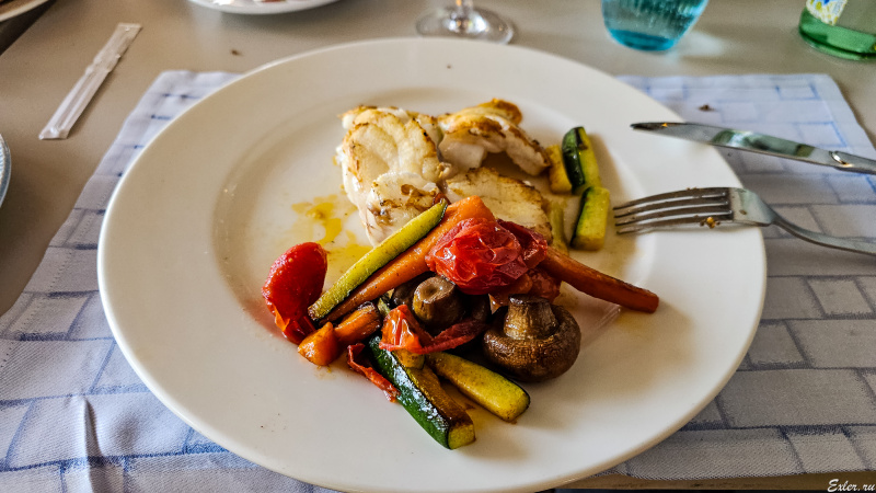 Рыба-чёрт (rape) на гриле. Деликатесная рыба, которую ловят в наших краях. В данном случае была свежайшая и приготовлена отлично. Но я уже в нескольких ресторанах натыкался на то, что ее готовят размороженную, а эта рыба заморозку не переносит: она теряет почти все свои вкусовые качества и становится невкусной и водянистой. Я поэтому ее редко заказываю в ресторанах, предпочитаю покупать свежей и самолично жарить на сковородке или на гриле. Рыба вкуснейшая. Но дорогое удовольствие - ее филе стоит 25 евро килограмм. Рыбина целиком (а у нее огромная голова) - 17 евро за килограмм.