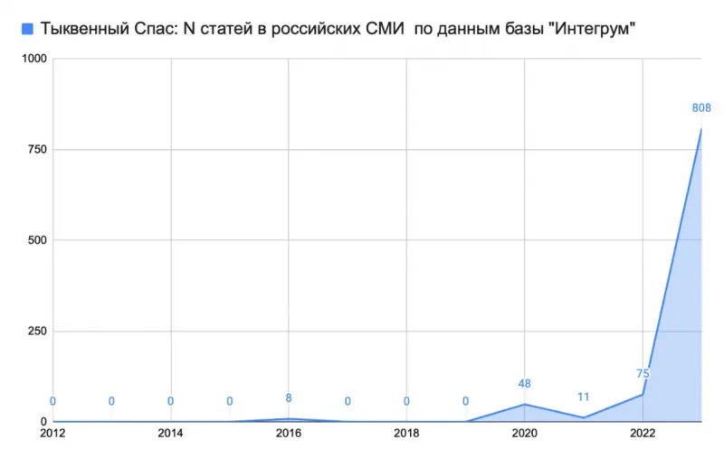 Чтобы проверить, когда появился этот загадочный праздник, можно использовать базу «Интегрум», где представлены статьи практически всех российских СМИ за последние 30 лет. Из этой базы видно, что само по себе словосочетание «Тыквенный спас», начиная с 2016 года, часто встречается в российских медиа в качестве расхожего анекдота (вроде «У нас в стране вместо Хэллоуина Тыквенный спас»).
