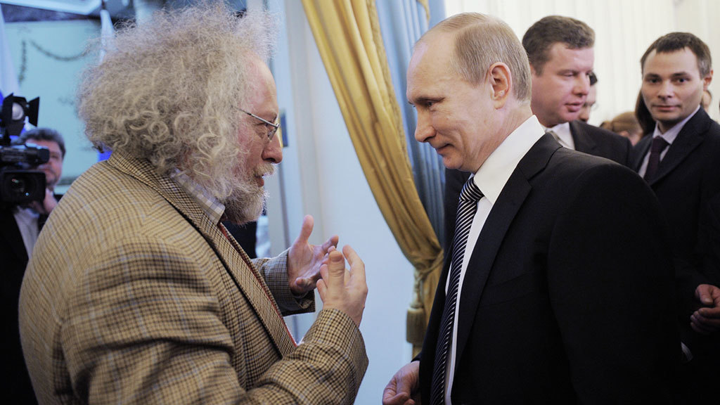 Алексей Венедиктов объясняет Владимиру Путину суть миролюбивой политики РФ. (Фото: Яна Лапикова / РИА Новости)