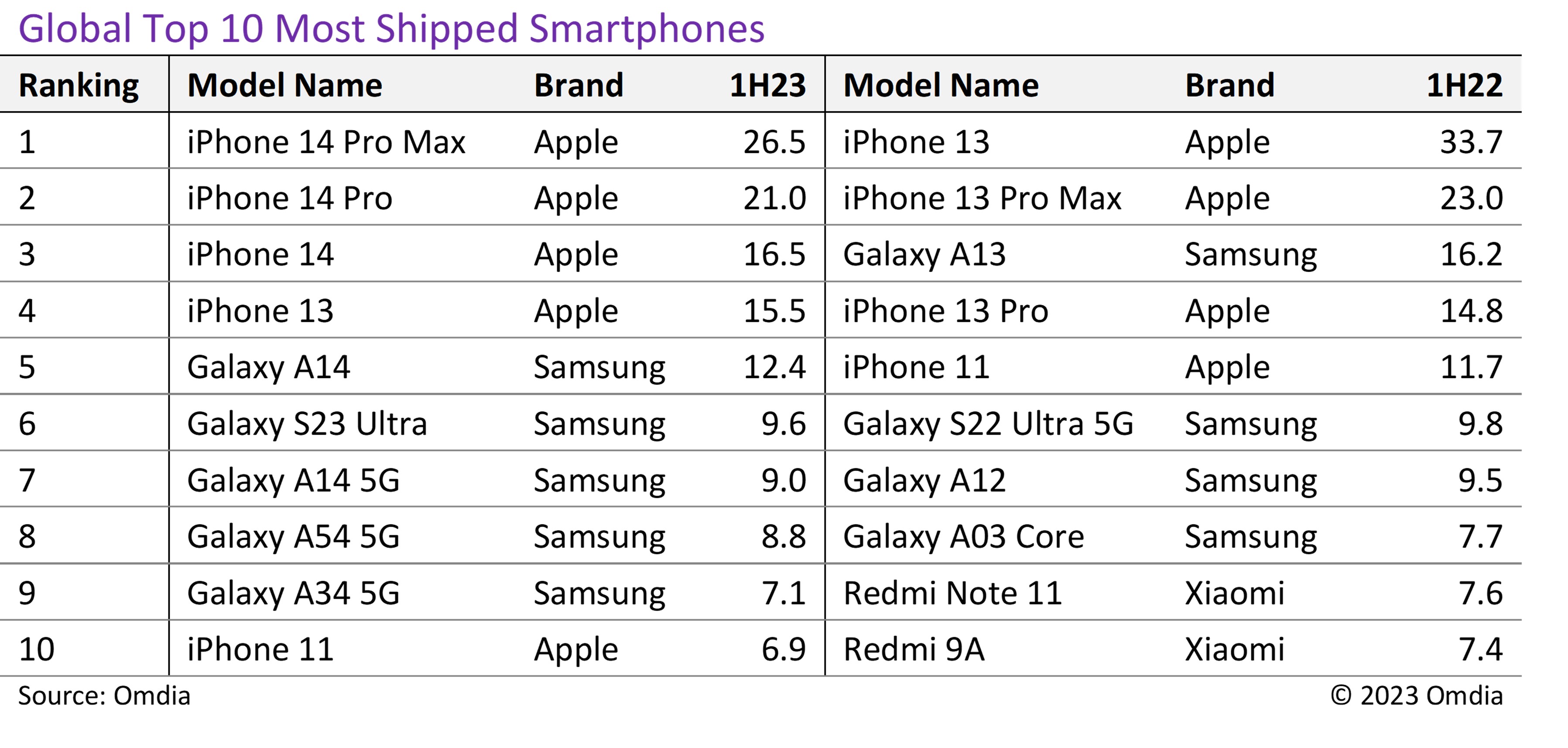 Британская аналитическая компания Omdia опубликовала свое исследование самых продаваемых моделей смартфонов в первой половине 2023 года.