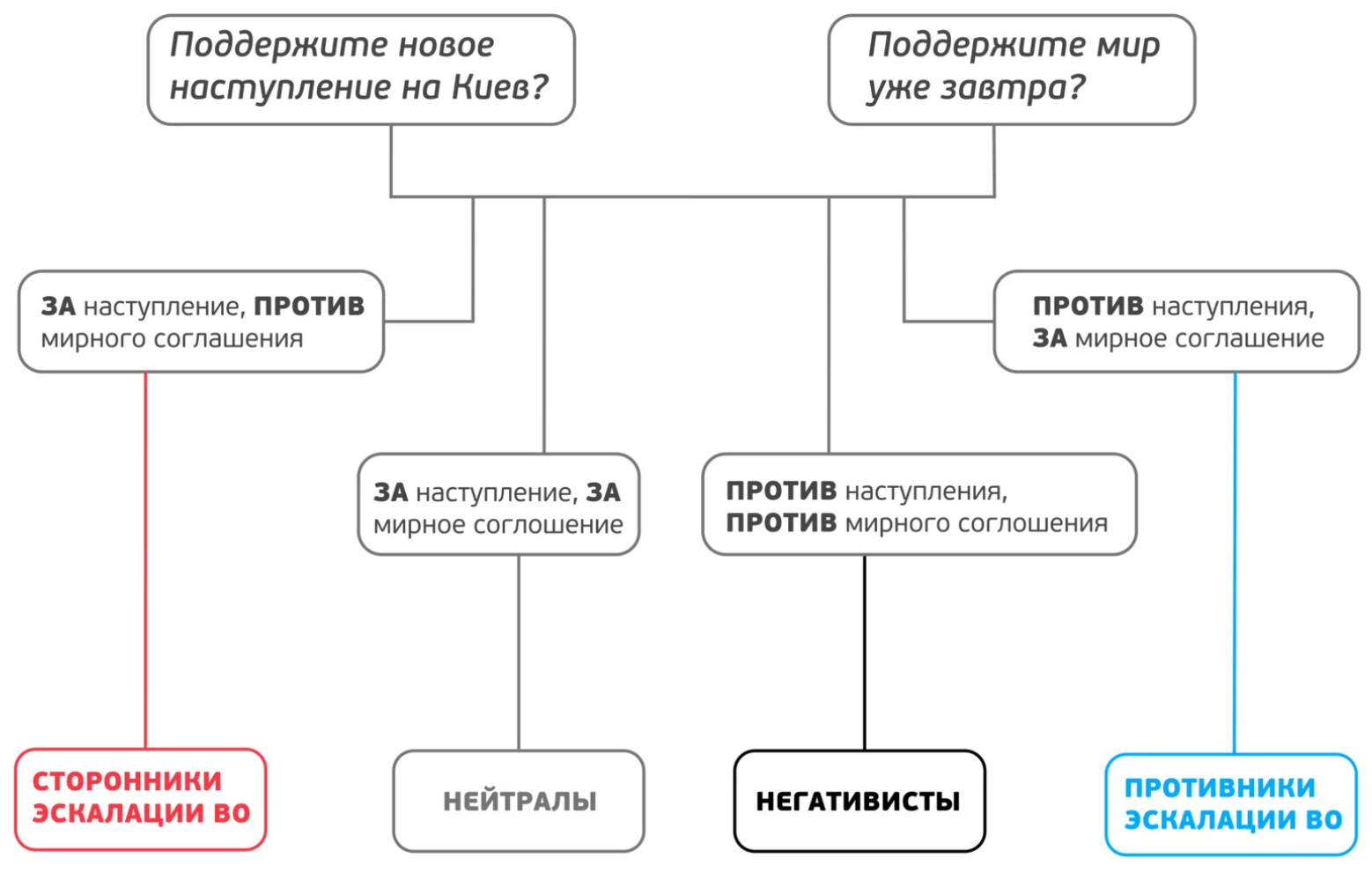 Независимая социологическая служба Russian Field провела очередной опрос по поводу реального отношения россиян к так называемой СВО. Опрошено было 1604 респондента в самых разнообразных регионах. Респонденты были разделены на несколько групп, исходя из вопросов анкета: сторонники эскалации ВО, нейтралы, негативисты, противники эскалации ВО.