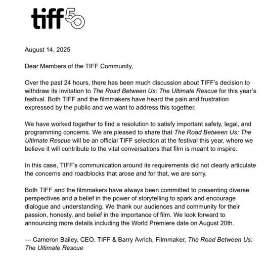 Международный кинофестиваль в Торонто (TIFF) отозвал приглашение для документального фильма The Road Between Us, в котором рассказывается о бывшем израильском генерале Ноаме Тибоне, спасшем свою семью в день атаки 7 октября.Об этом сообщил портал Yahoo со ссылкой на заявление организаторов фестиваля и публикацию IndieWire.