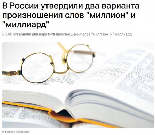 МОСКВА, 14 авг — РИА Новости. Институт русского языка имени Виноградова РАН утвердил два варианта произношения слов "миллион" и "миллиард", выяснило РИА Новости, ознакомившись с содержанием орфографического словаря русского языка как государственного.