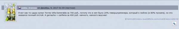 По поводу Viña Esmeralda (см. выше) тоже прикольно. Оно понятно, что вино - дело вкусовое, но назвать вот это данное вино полным отстоем - это я уж и не знаю, насколько извращенный вкус нужно иметь. В Испании (и не только там) это вино очень популярно. Оно по характеру ближе к десертным, однако также вполне хорошо идет к морепродуктам, мы его нередко заказываем. Это вино побеждало на каких-то международных конкурсах (в 2014 году было призером на очень престижном конкурсе в Брюсселе), поставляется в 140 стран. Видимо, в этих странах любят пить полный отстой, бывает.