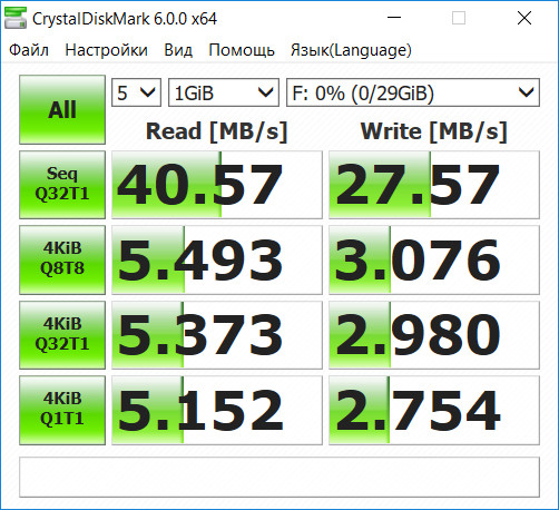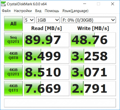 Тест быстродействия на компьютере. Раза в два быстрее, чем предыдущая флешка.