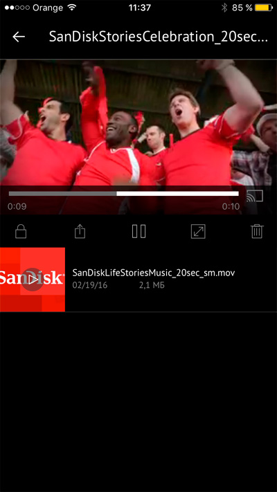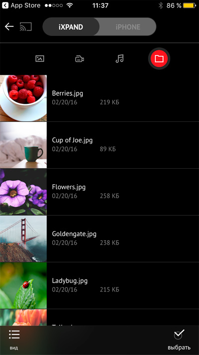 Для работы с ней на айфоне-айпэде, разумеется, нужно установить специальную программу из iTunes Store - SanDisk iXpand Drive.