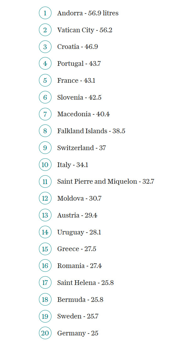 Лидируют здесь Андорра и Ватикан (просто их не видно на карте). В Андорре, только представьте, на одного человека приходится 56,9 л вина в год, то есть примерно 76 бутылок.