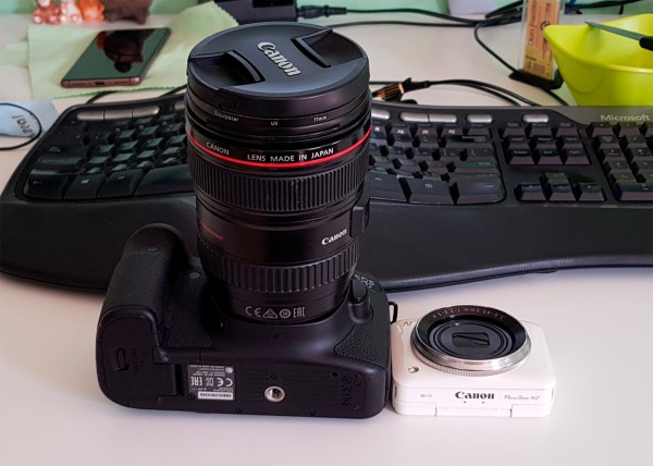 Приехал вот такой прикольный фотик - Canon Powershot N2. Вон он белый рядом с 6D.