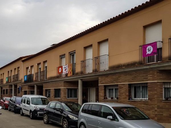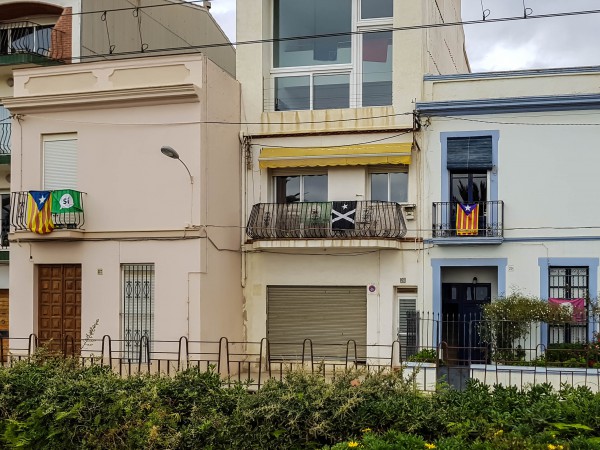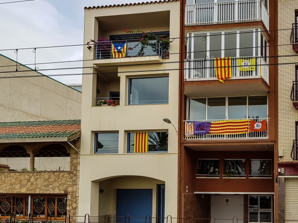 В нашем городке пока вся вот эта символика за независимость висит, равно как баннеры и плакаты с требованием демократии - то есть провести референдум. Как с этой демократией соотносится то, что председатель Путчдемон сам с легкостью херит даже местные каталонские демократические процедуры (все эти декларации о независимости протаскивают через Парламент буйным нахрапом и полностью игнорируют оппозицию) - не очень понятно. Но, видимо, демократия требуется от Мадрида, а от Путчдемона она не требуется, он и так свой парень.