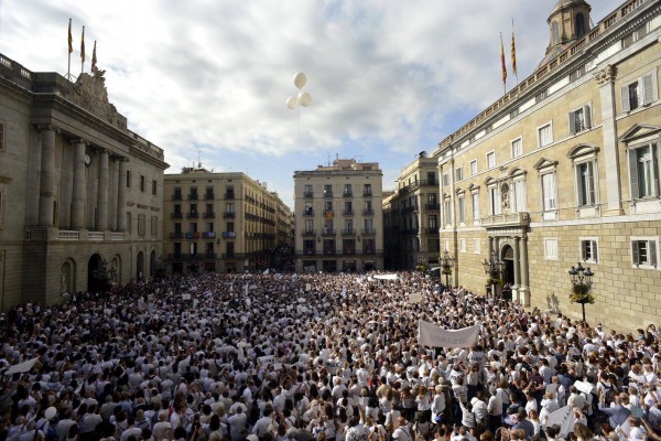Большая демонстрация людей, призывающих Мадрид и Барселону к диалогу. Одеты в белое и держат в руках плакаты с надписью "Поговорим?".