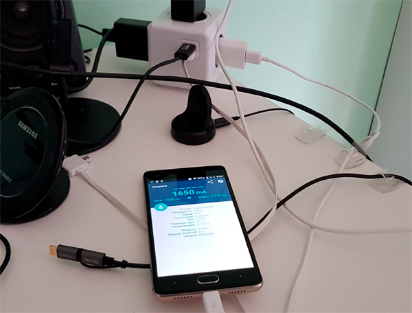 Но у меня тут под руками есть адаптер от iPhone 7, который использует супруга, я воткнул в него андроидный телефончик с очень полезной программой Ampere и посмотрел, сколько адаптер выдает. Так вот, под 2 ампера адаптер выдает, Никита, не надо гнать!