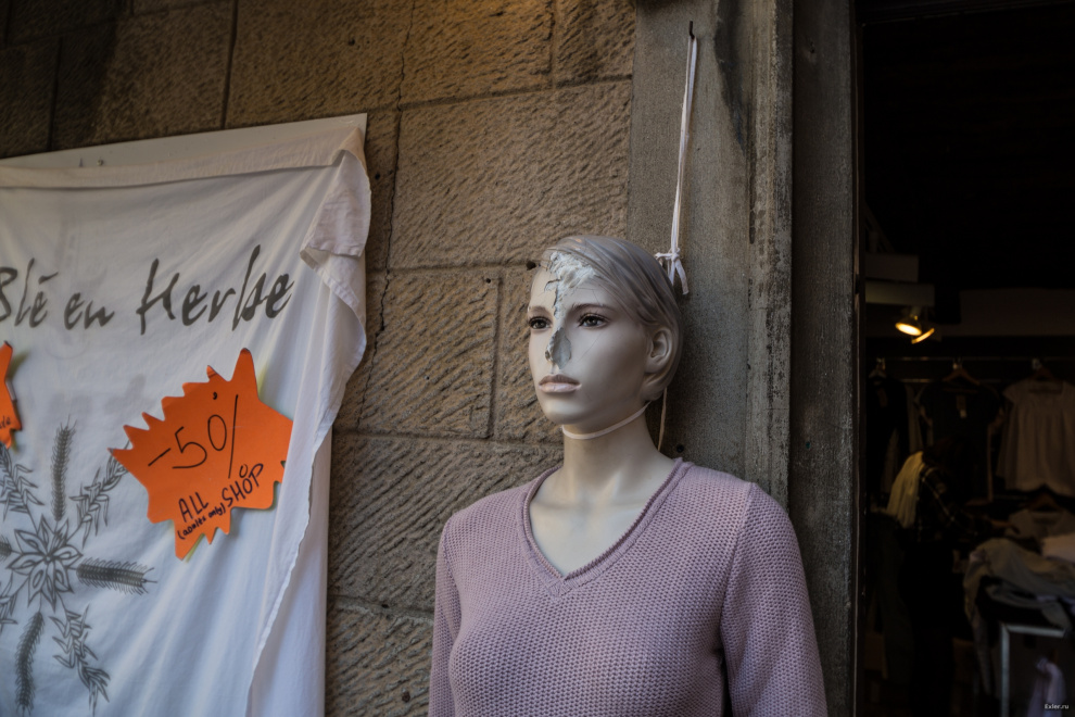 Грустная манекенша. Она уже видать падала, в результате чего заработала различные болезни на лице. Теперь ее подвесили за шею, чтобы не расколотила остатки носа.