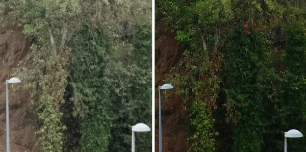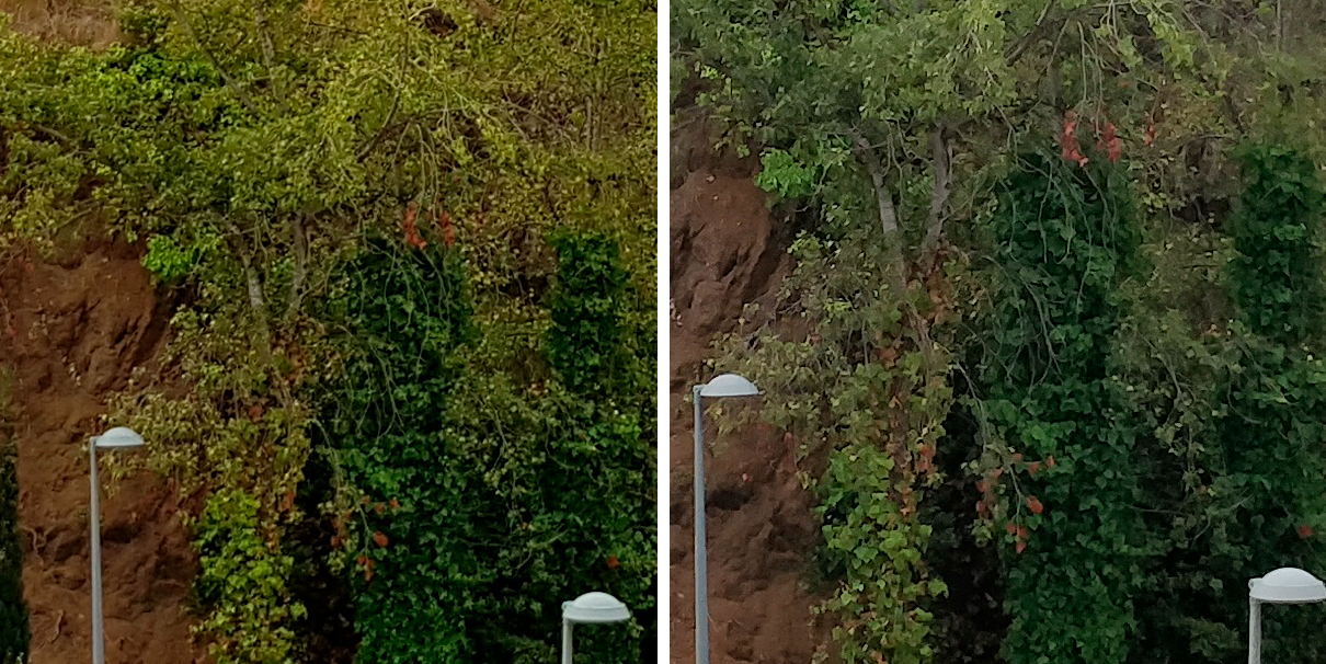 То же самое для OnePlus 5 - слева RAW, справа JPG. OnePlus тоже добавляет контраста и насыщенности, но так не шарпит, как Samsung.