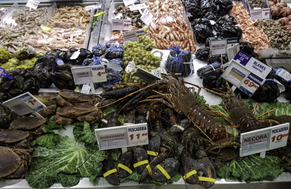 В отделе морепродуктов живые лангусты по еще более негуманной цене. А я как раз стоял в очереди за парочкой очень пожилых сеньора и сеньоры. Они как раз взяли пару лангустов, пару кило окуня, морского черта и еще всяких рыбок-морепродуктов. Где-то на триста пятьдесят евро. Видать, хорошая у них пенсия.