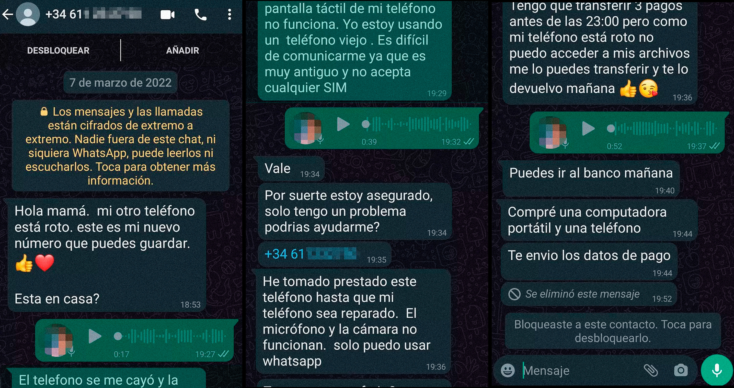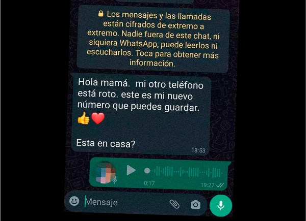 Испанские мошенники (если они вообще испанские) приняли на вооружение развод, бывший очень популярным в Восточной Европе. Здесь это называется "El hijo en apuros" - "Сын в беде". Статья в El Mundo - "El nuevo timo de WhatsApp de 'El hijo en apuros': "Mamá, se me ha roto el teléfono, necesito una transferencia" (Новое мошенничество в WhatsApp от "сына в беде": "Мама, мой телефон сломался, мне нужен перевод"). Впрочем, там пишут, что этот развод также был очень популярным в странах Латинской Америки.