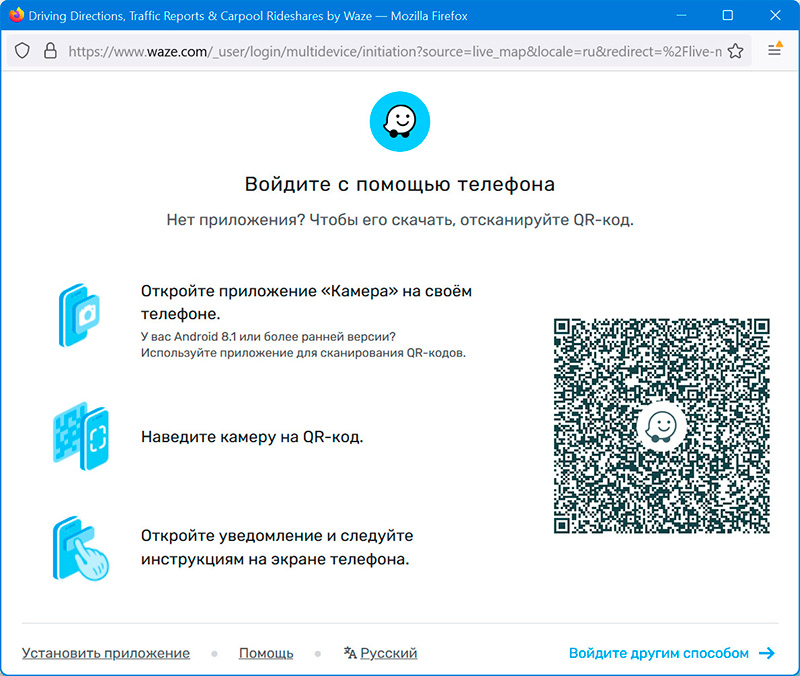 После этого вам предложат установить приложение на смартфон (Android и iOS), если оно не установлено, или там надо нажать "Войдите другим способом", если приложение уже установлено, и просто залогиниться в Waze со своей учетной записью.