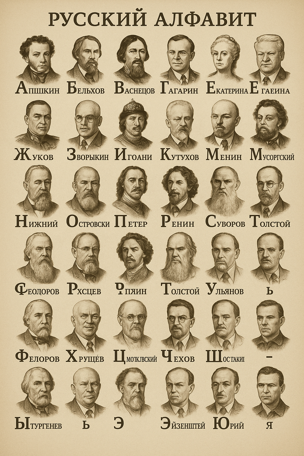 Попросил ChatGPT нарисовать русский алфавит с самыми известными деятелями России - их именами и изображениями.