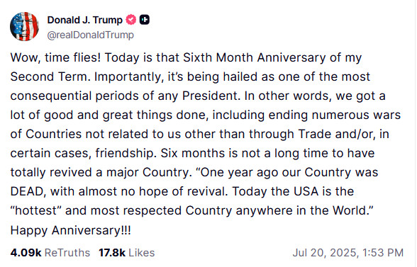 Вау, как летит время! Сегодня шестимесячная годовщина моего второго срока. Важно отметить, что этот период считается одним из самых значимых в истории любого президента. Другими словами, мы сделали много хорошего и великого, в том числе положили конец многочисленным войнам стран, которые не были связаны с нами ничем, кроме торговли и/или, в некоторых случаях, дружбы. Шесть месяцев — не такой уж долгий срок, чтобы полностью возродить крупную страну. «Год назад наша страна была МЕРТВА, и надежды на ее возрождение практически не было. Сегодня США — самая «крутейшая» и уважаемая страна в мире». С юбилеем!!!